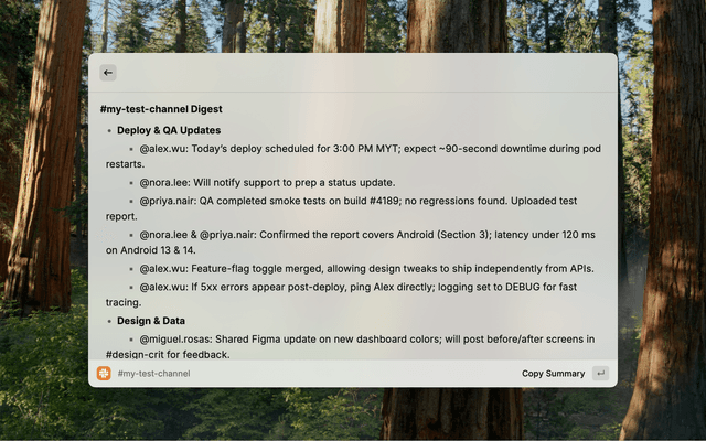Summarize any Slack channel or thread directly from Raycast using OpenAI. Perfect for catching-up after vacations, keeping stakeholders in the loop, or turning noisy discussions into succinct, bullet-point briefs.