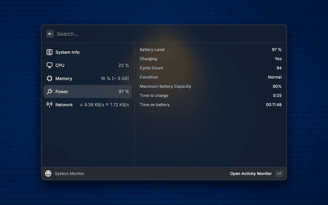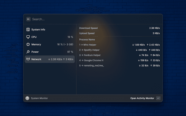 This is a Raycast extension that allows you to monitor your system's CPU, Memory, Disk and Battery usage.