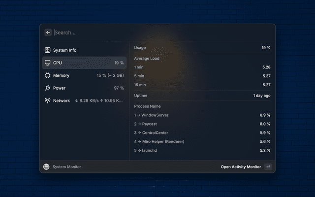This is a Raycast extension that allows you to monitor your system's CPU, Memory, Disk and Battery usage.