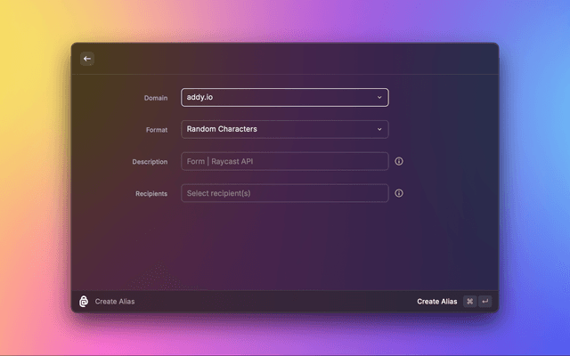 Manage your Addy.io email aliases directly from Raycast. Create, search, and send emails using your anonymous aliases without leaving your keyboard.