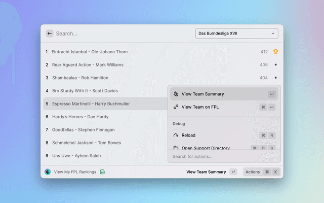 See where you rank amongst in your league rivals in Fantasy Premier League within Raycast.