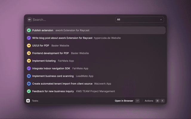 This is a Raycast extension with commands for the work management platform awork.