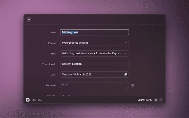 Log time for a task or project right in Raycast. Press ⌘⏎ to submit.