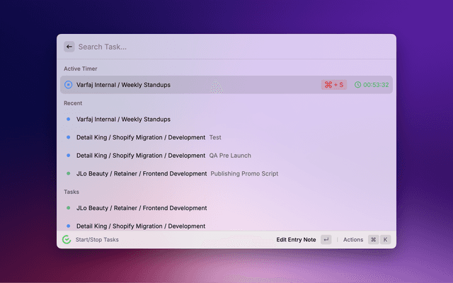 ENTER: Open form to edit the timer.CMD + S: Stop the timer.ENTER: Start the timer for the task with the same task note/description and close Raycast.CMD + S: Start the timer for the task with the same task note/description.ENTER: Start the timer for the task and open form view to edit the note/description for the timer.CMD + S: Start the timer for the task.This view is used to edit the active timer info.