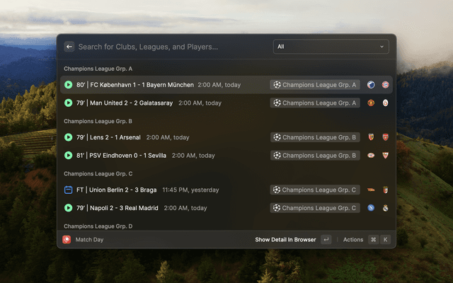 Stay updated with the football world without leaving your workflow. This Raycast extension provides quick access to live scores, match schedules, league tables, team information, and player data from Fotmob's comprehensive football database.