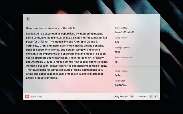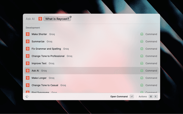 Groq's API offers a wide range of AI models, such as Mistral, Google and Meta's Llama models, with insanely fast speed (Llama3 70B with over 250 t/s). With this powerful extension, you can boost your productivity using advanced AI models without having to leave your Raycast interface.