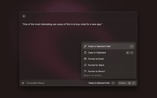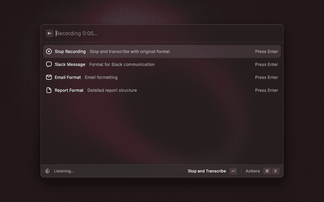 - Press Enter to stop and transcribe, or select a specific format (Email, Slack, Report)