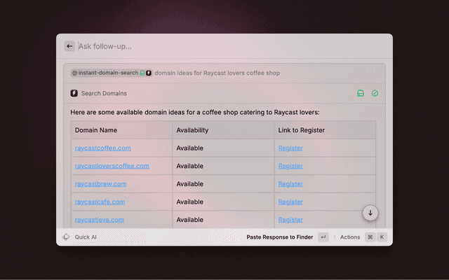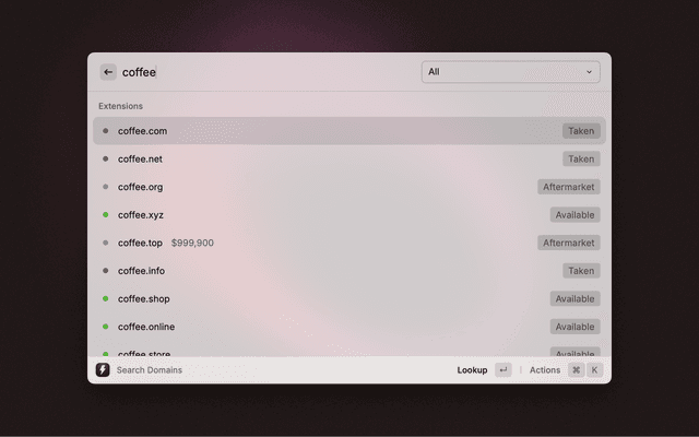 The fastest domain name search tool on the internet, now available as a Raycast extension. Search for available domain names instantly with real-time results powered by instantdomainsearch.com.