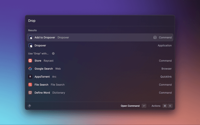 Add selected files to Dropover with a single click from Raycast.