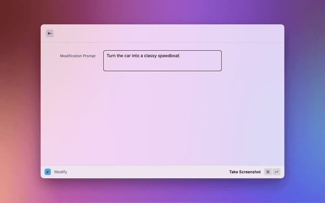 AI Screenshot allows you to take screenshots and modify them using Generative AI. It combines the GPT-4o's multimodal capability to generate a description of the image, and DALL-E's ability to generate convincing images from text descriptions.