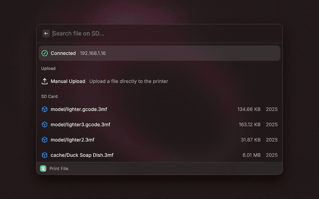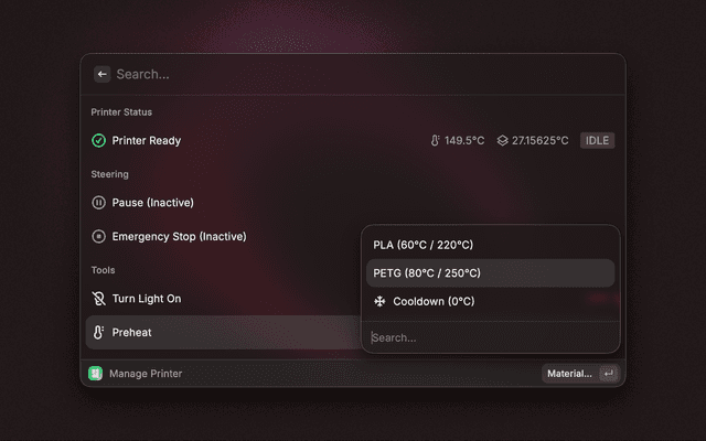 Bambu Lab Controller brings your 3D printer directly into Raycast. Manage your prints, control temperatures, and handle files instantly without breaking your workflow.