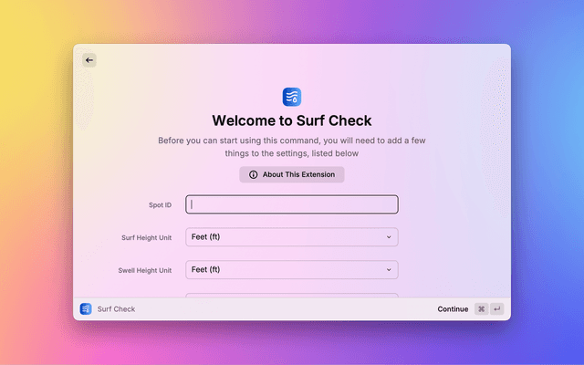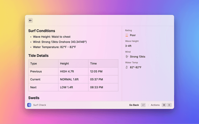 Surf Check is a Raycast extension that provides quick access to surf conditions and forecasts for your nearby surf spots. Using data from Surfline, this extension allows you to check wave heights, wind conditions, water temperature, and more.