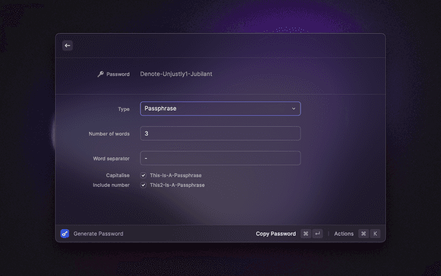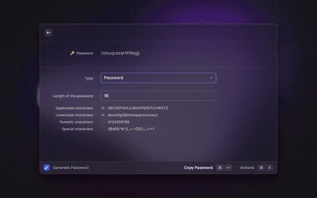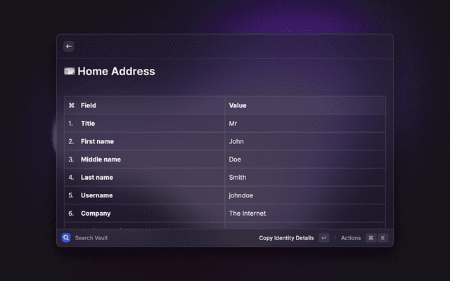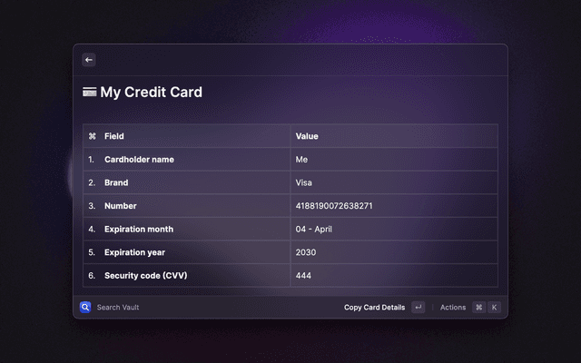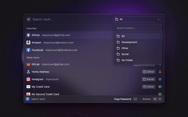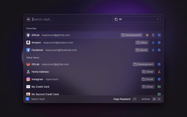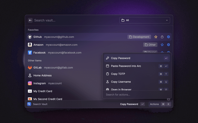 🔎 Search your vault 📋 Copy and paste any field 🔑 Generate passwords and TOTP codes ⭐ Mark items as favorites