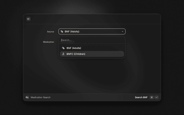 - Dual Formulary Support: Seamlessly toggle between BNF (Adults) and BNFC (Children) using a simple dropdown menu.
