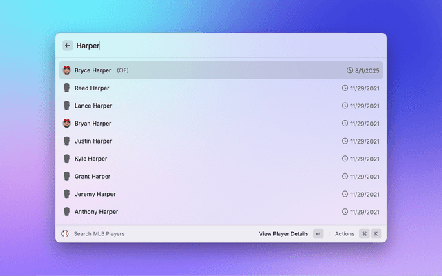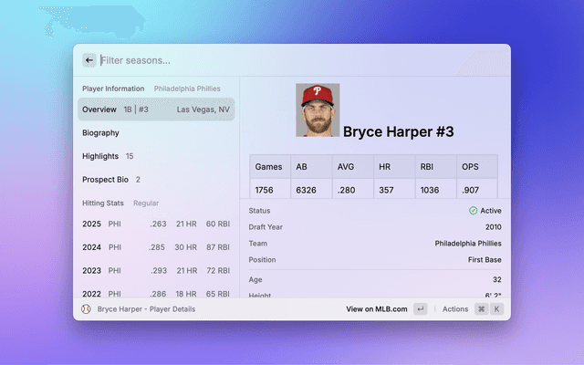 Quickly look up active MLB players by name. View primary info at a glance and jump to player details. Powered by the official MLB API.