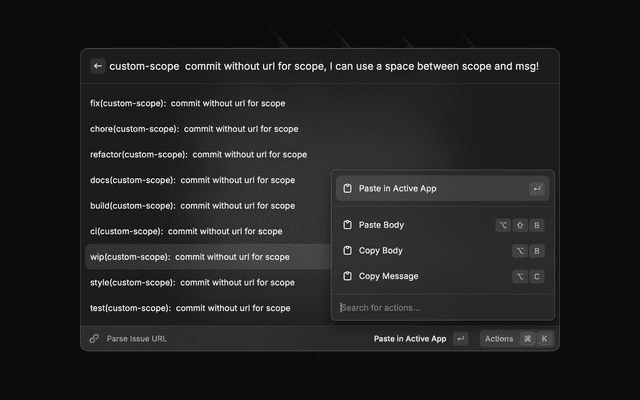 This Raycast plugin allows you to parse your issue urls (such as Jira, GitHub and GitLab) to provide you with a commit name and description that you can use with Git!