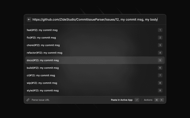Enter to paste in your active app the commit message you've selectedWhile typing your url, you can specify optional parameters separated by , in the following order: