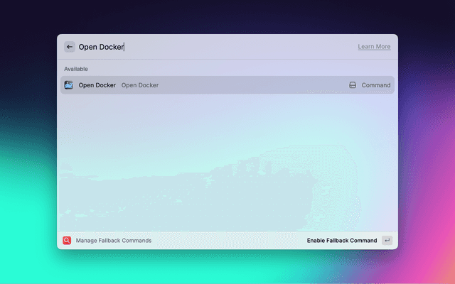 - You use Raycast to search for "Docker" and hit Enter.