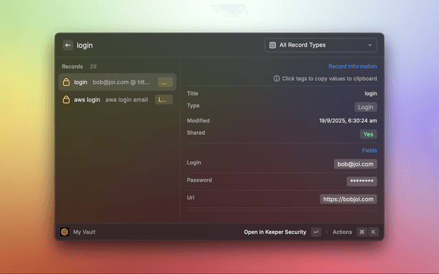 A comprehensive Raycast extension that provides seamless access to your Keeper Security vault directly to your macOS desktop. Manage records, generate secure credentials, and access your vault records without leaving your workflow.