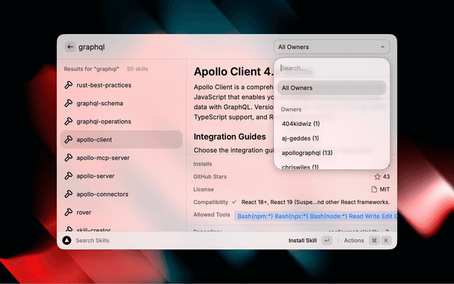 - View skill details inline with SKILL.md content, including description, license, compatibility, and allowed tools (toggle with Cmd+D)