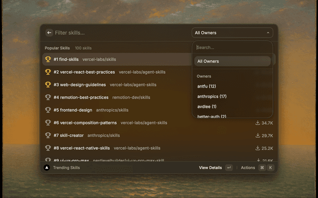 View and remove installed skills. Filter by agent to see which skills are available for each AI agent.
