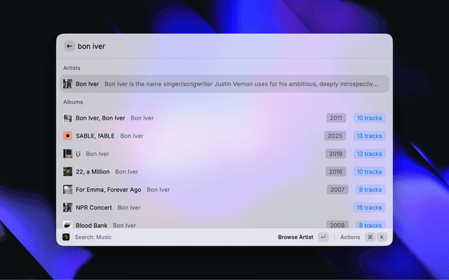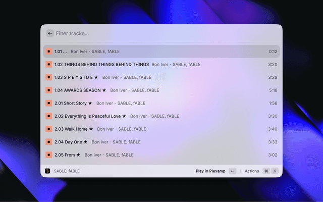Browse Library: browse the selected Plex music library, artists, albums, playlists, and queue tracks or entire albums in PlexampSearch Library: quickly search artists, albums, and tracks and play/queue them in PlexampNow Playing: see what's playing, control the transport and adjust the queueNow Playing Menubar: show the current album art and a customizable now playing label in the macOS menu barPlexamp Status: inspect the connected Plexamp client and selected Plex music libraryPlexamp URL Override if your Plexamp or Plexamp Headless instance is not available at http://127.0.0.1:32500.Menubar Format with {track}, {album}, and {artist} tokens for the Now Playing Menubar command.Now Playing.Now Playing.Plexamp Status.5 Stars, 5 Stars (Half Stars), or 1 Star.