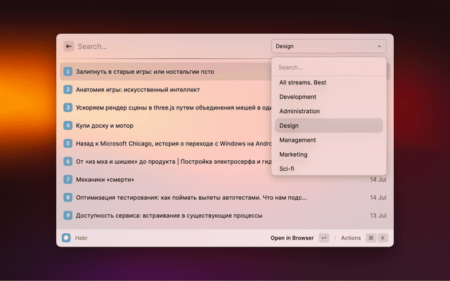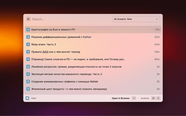 This is a simple extension that allows you to read Habr news. It works directly in Raycast, no external applications or dependencies are required