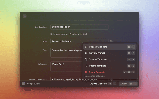 Prompt Builder is a Raycast extension that helps you craft the perfect AI prompts efficiently. It makes it easy to define roles, tasks, tone, audience, and constraints, helping make AI output more accurate and consistent. Build structured prompts with templates, preview them, and copy instantly to your clipboard.