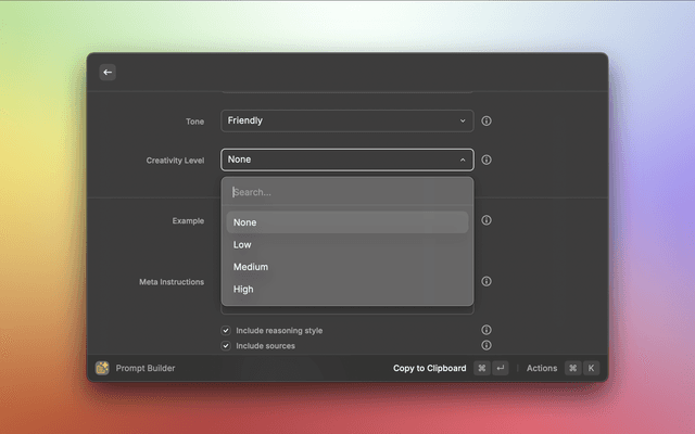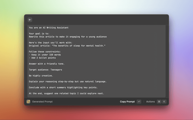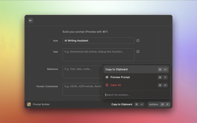 Prompt Builder is a Raycast extension that helps you craft the perfect AI prompts efficiently. It makes it easy to define roles, tasks, tone, audience, and constraints, helping make AI output more accurate and consistent. Then preview and copy your prompts instantly.