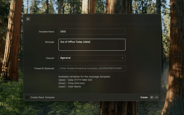 Create Slack TemplateDaily Report){date} - Current date (YYYY-MM-DD){time} - Current time (HH:MM){user} - Your Slack usernameSend Slack Message⌘ + E to edit or ⌃ + X to delete the selected templateExport Templates~/Downloads/slack-templates.jsonImport Templates
