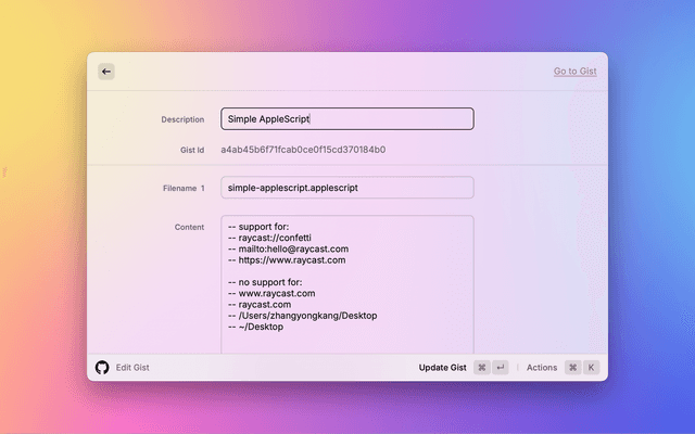 This extension brings GitHub Gist support to Raycast via OAuth 2.0.