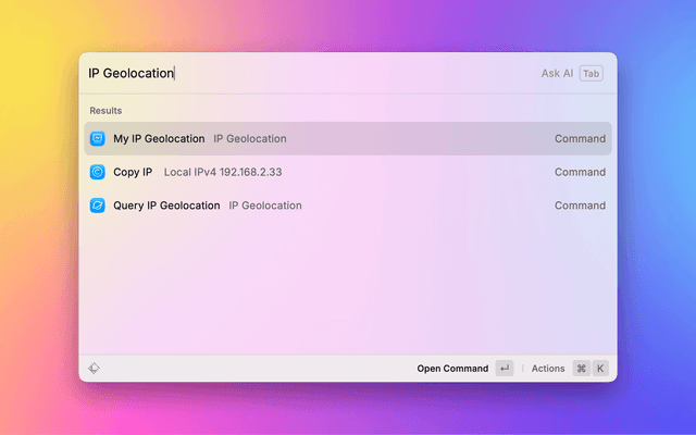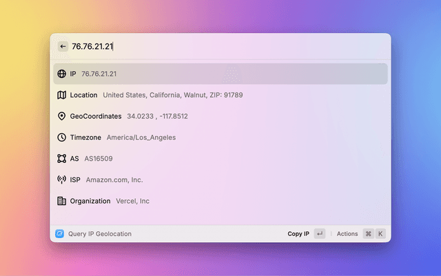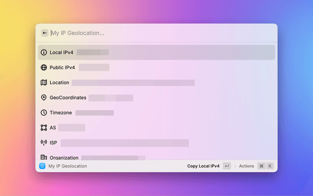 Show local and public IPv4/IPv6 address. Query geolocation for any IP address or domain.