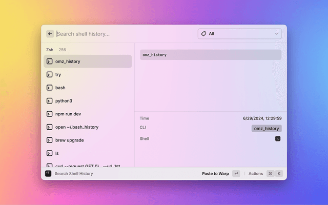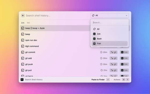 Search shell command history from zsh, bash, and fish.