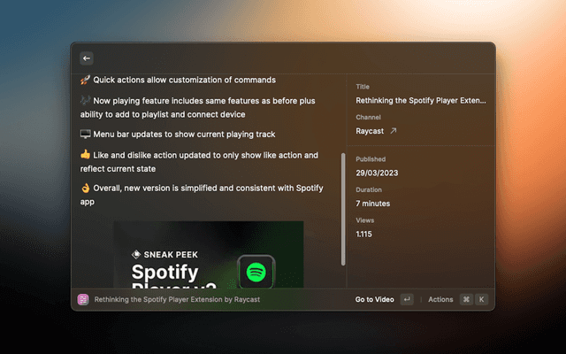 Summarize any YouTube Video with AI and ask follow up questions to get all the details. Choose between Raycast, OpenAI ChatGPT or Anthropic Claude. You have to either be a Raycast Pro Member, have access to an OpenAI API Key or Anthropic API Key to use this extension. Alternatively, you can use the extension with Ollama to summarize YouTube videos using a local LLM.