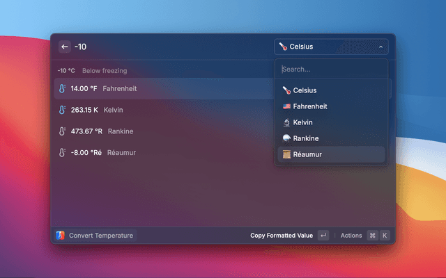 - Select your default unit (Celsius, Fahrenheit, Kelvin, Rankine, or Réaumur)