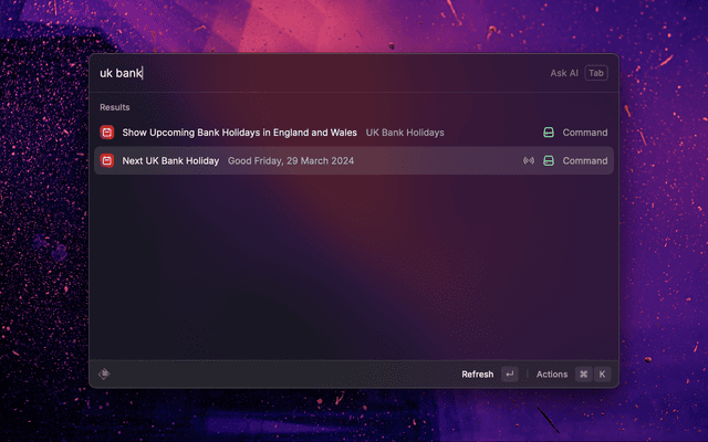 This Raycast extension provides upcoming bank holiday information for England and Wales.