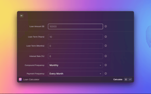 A comprehensive loan calculator extension for Raycast that helps you calculate loan payments with customizable terms and payment schedules.