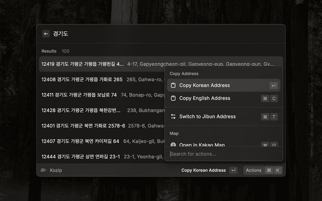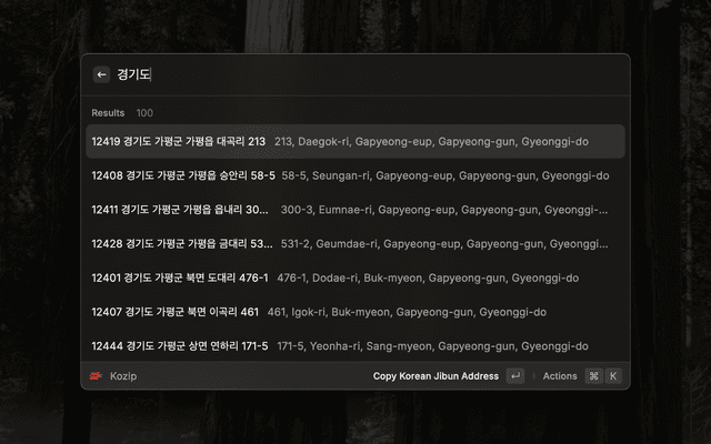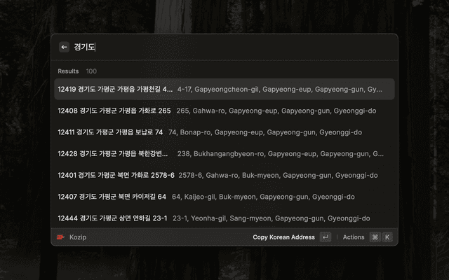 Postcodify API를 사용하여 한국 주소를 검색하는 Raycast 확장입니다. 다양한 형식의 한국 주소를 빠르게 찾고 복사할 수 있습니다.
