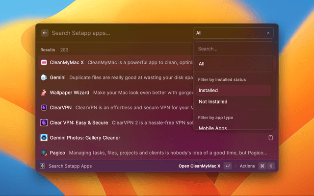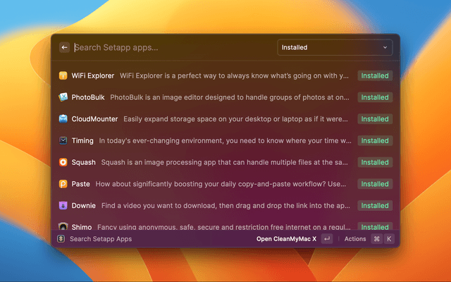 Search apps in Setapp, and filter by your installed.