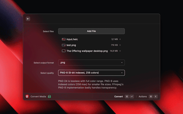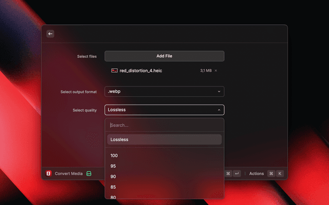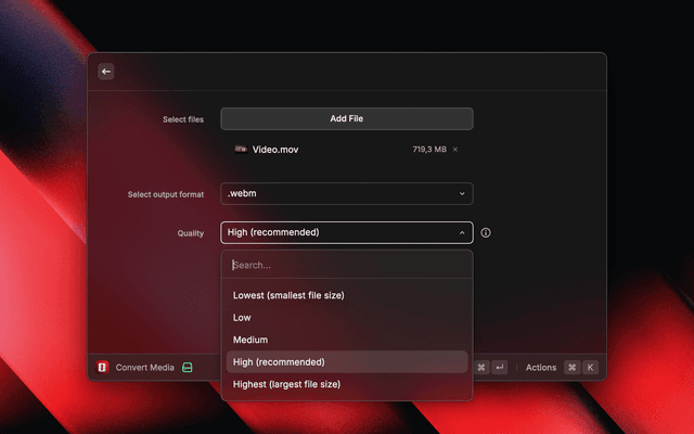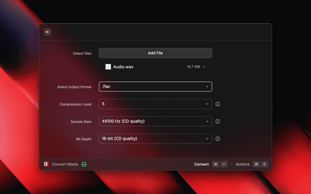 By default, audio and video formats will only propose 5 quality levels. Want more granular control, like encoding method, bitrate, bit depth, etc? Open the extension preferences and turn on "More Conversion Settings (Advanced)".
