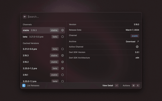 This extension uses the FVM CLI to manage installed Flutter SDKs. The extension uses its own FVM binary to avoid compatibility issues with the host system.