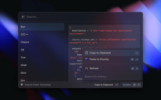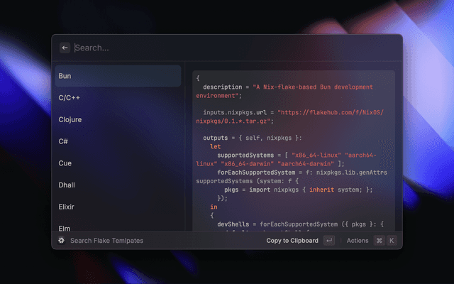 Search and use development environment templates from the-nix-way/dev-templates directly in Raycast.