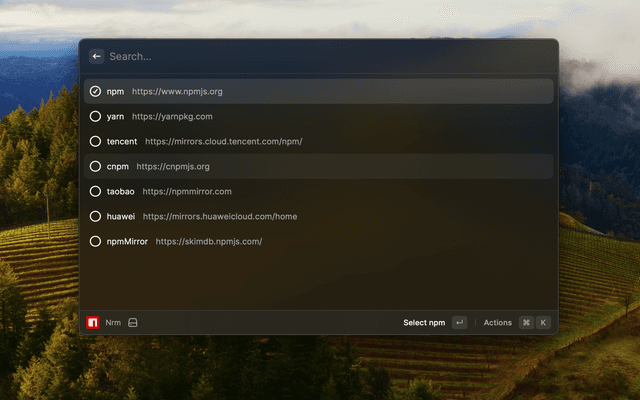 raycast-nrm can help you easy and fast switch between different npm registries, now include: npm, yarn, tencent, cnpm, taobao, npmMirror.