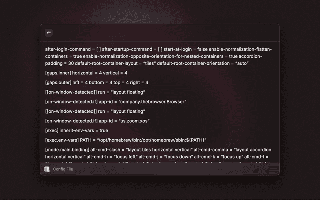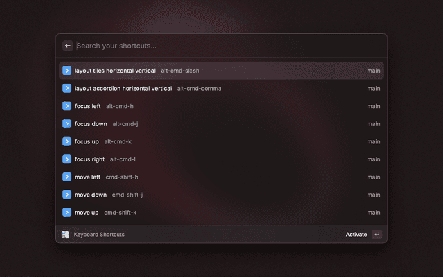 aerospace config --config-path)Aerospace to view the available commandsAerospace Shortcuts command to view all shortcuts parsed from your config fileAerospace Configuration command to view your Aerospace configurationAerospace Menubar Shortcuts command to enable menubar shortcutsAerospace Switch Apps command to show the app in current workspaceThe extension supports programmatic access via Raycast deeplinks using launchContext. This allows integration with window tile manager tools like SketchyBar, Alfred, Keyboard Maestro, or custom scripts.
