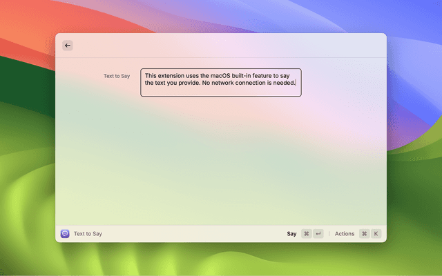 This extension uses the system built-in text-to-speech engine on macOS and Windows to say the text you provide. No network connection is needed.