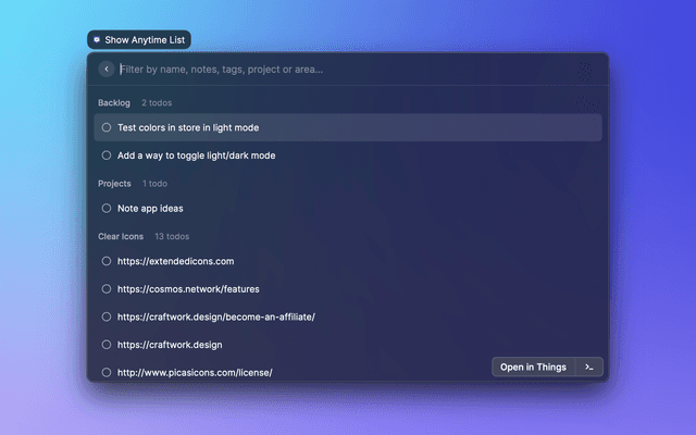 Things → Settings → General → Enable Things URLs → Manage.If you don't see any of your to-dos in any commands, please make sure Things is installed and running before using this extension. If Things is running, you may need to grant Raycast access to Things in System Settings > Privacy & Security > Automation > Raycast > Things.