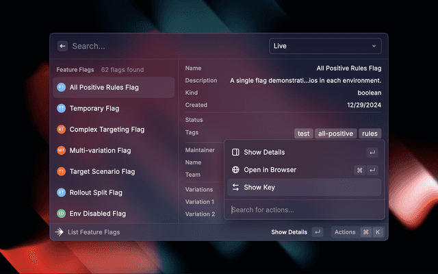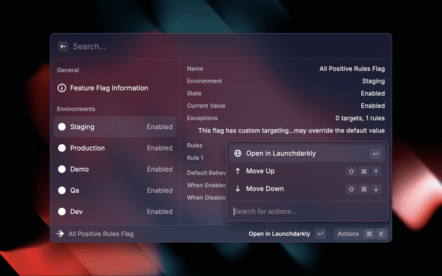 Quickly access and manage your LaunchDarkly feature flags directly from Raycast. View flag details, environments, and targeting rules without leaving your keyboard.