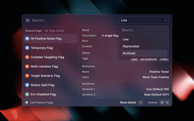 - Filter flags by state using the dropdown (Live/Deprecated/Archived)