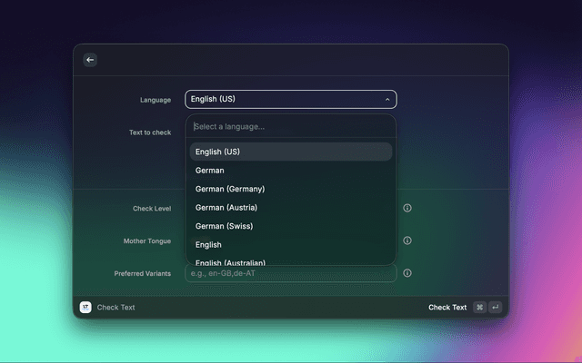 Instant spelling and grammar correction using LanguageTool API. Get real-time suggestions and improve your text quality in multiple languages.