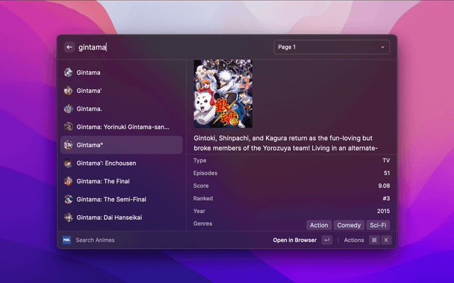 In the list view, you can toggle between simple and detailed views with the action "Cmd+Enter". Navigate through the results with the pagination! When search bar is empty, it will show you the seasonal animes. NSFW animes are hidden by default but you can toggle their visibility in the settings.